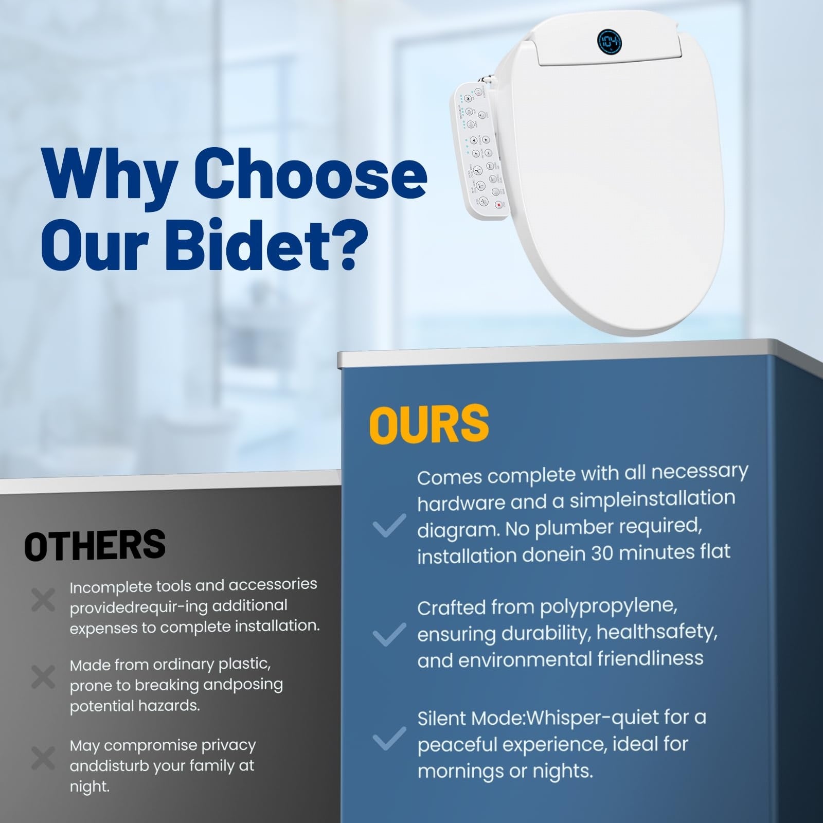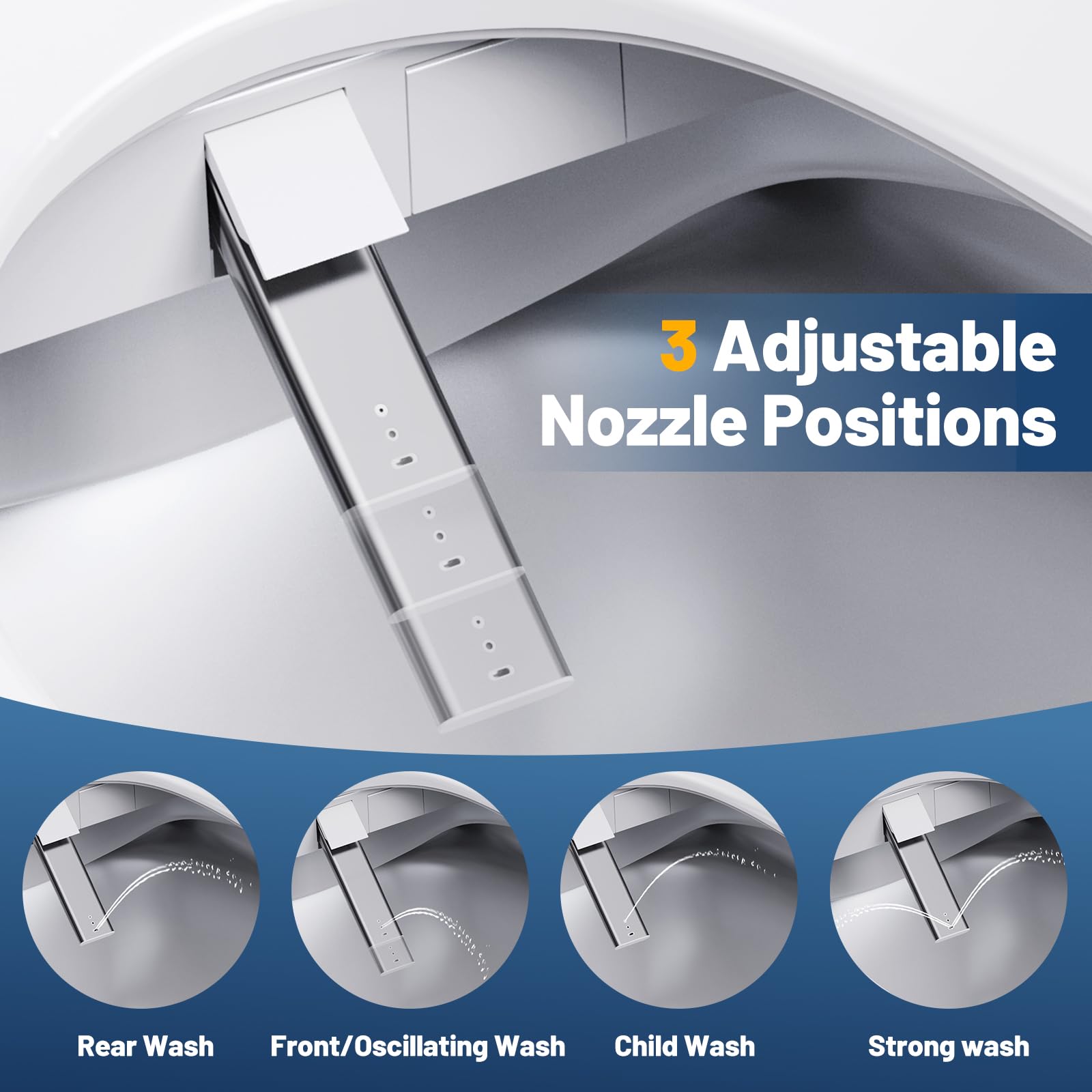 Enhanced Hygiene & Maintenance: The bidet maintains pristine cleanliness effortlessly with the self-clean nozzle feature, ensuring sanitary use every time. Plus, the silent close lid prevents slamming, protecting the seat and maintaining a peaceful bathroom environment.
