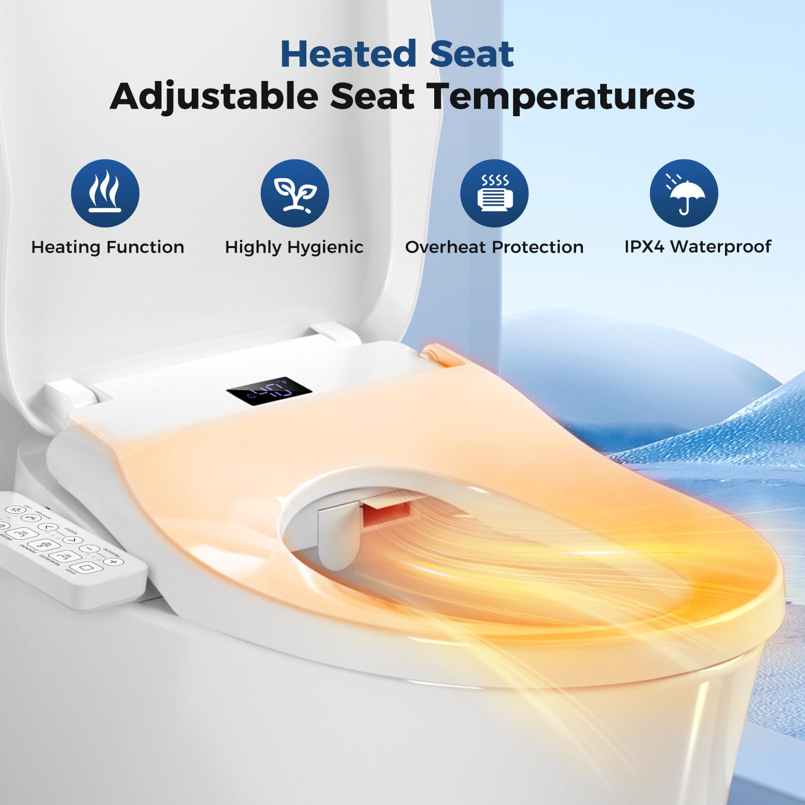 Ultimate Comfort & Warmth: Experience year-round luxury with the electric heated toilet seat, offering three adjustable temperature settings for personalized comfort. Say goodbye to cold shocks and enjoy soothing warmth every time you sit down.