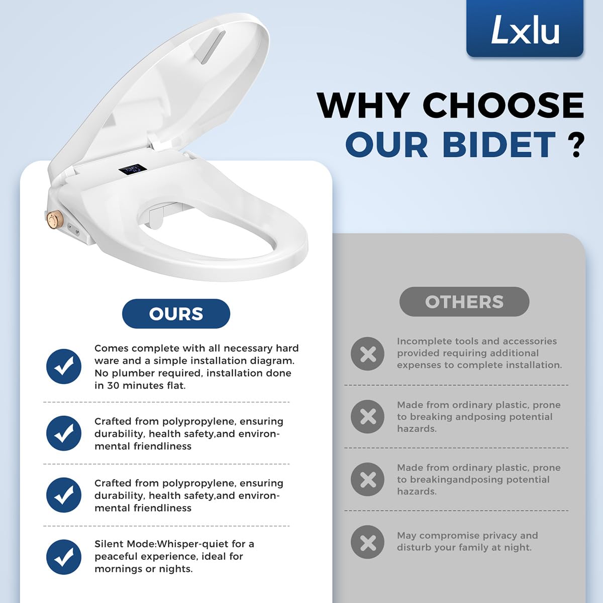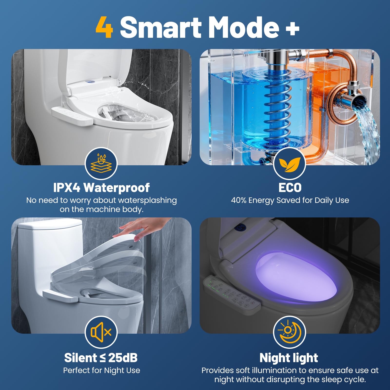 User-Friendly Design & Nighttime Safety: The toilet seat navigates your bathroom safely at night thanks to the built-in, soft glow nightlight. The sleek design and intuitive controls make this bidet toilet seat easy for anyone to use and enjoy.